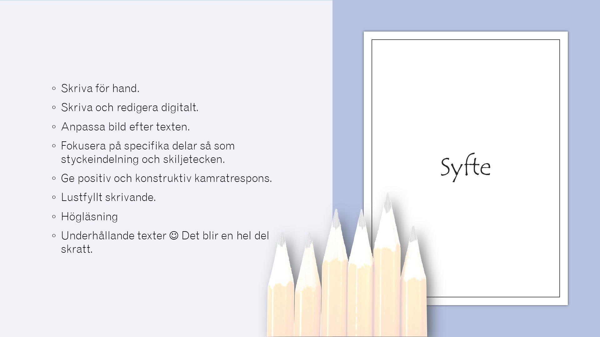 De övar bland annat att skriva för hand, att redigera text, att ge kamratrespons, att samarbeta med mera.